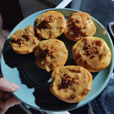 Po upieczeniu serniczki odstawiamy do wystudzenia. Gdy ostygną, smarujemy ich wierzch masą krówkową i posypujemy odłożonymi wcześniej, rozkruszonymi ciasteczkami lotus.
