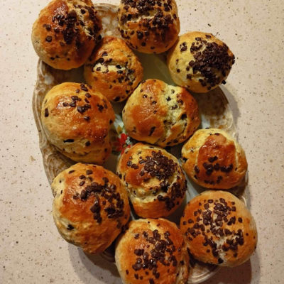 Następnie z wierzchu smarujemy roztrzepanym jajkiem i układamy kropelki czekoladowe. Pieczemy 20-25 minut w 180 stopniach.